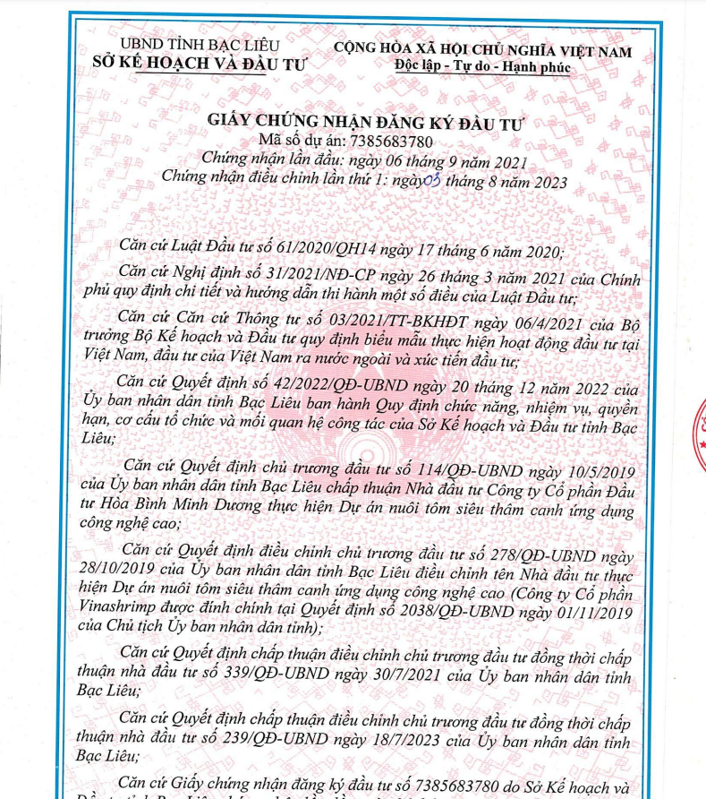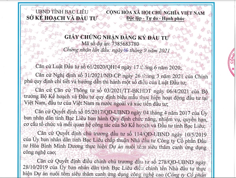 Công Ty Cổ Phần VINASHRIMP đã quyết định nghiên cứu quy hoạch đầu tư xây dựng hạ tầng Khu nuôi tôm siêu thâm canh ứng dụng công nghệ cao tại xã Vĩnh Thịnh, huyện Hòa Bình, tỉnh Bạc Liêu. Phát triển thành vùng nuôi tôm tập trung theo hướng nuôi siêu thâm canh có ứng dụng công nghệ cao, bền vững và thân thiện với môi trường. Trên cơ sở bảo đảm hiệu quả kinh tế, an toàn dịch bệnh và bảo vệ môi trường sinh thái.111