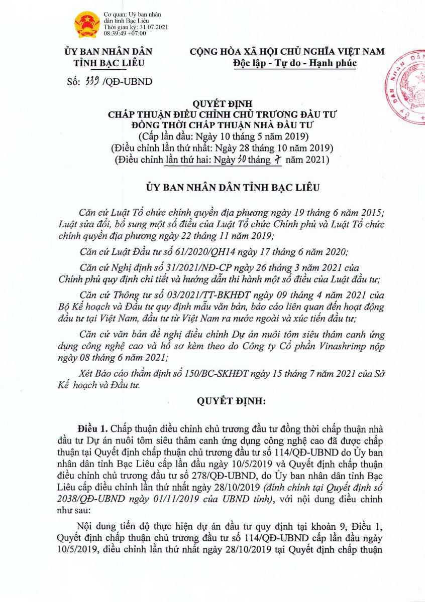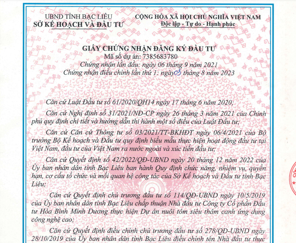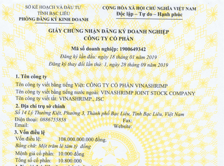 Công ty Cổ phần VINASHRIMP, số đăng ký kinh doanh 1900649342 do Sở KH và Đầu tư Bạc Liêu cấp ngày 18/01/2019, được thành lập để đầu tư hạ tầng nuôi Tôm ứng dụng công nghệ cao tại Đồng Bằng Sông Cửu Long. Công ty đã và đang triển khai xây dựng dự án “ Khu nuôi tôm siêu thâm canh ứng dụng công nghệ cao” tại xã Vĩnh Thịnh, huyện Hòa Bình, tỉnh Bạc Liêu. Dự án có tổng diện tích 490ha, được thiết kế thành 72 Farrm, trong đó có: 24 farm (với 1 farm = 6 ao + 2 ao dèo) và 48 farm (với 1 farm = 9 ao + 3 ao dèo), và 4000m2 dành cho loại farm ( 4 ao + 2 ao Dèo) . Toàn bộ Dự án được đầu tư cơ sở hạ tầng đồng bộ, khép kín, có hệ thống kiểm soát toàn bộ quy trình nuôi. Công ty chúng tôi, với mục tiêu phát triển Nông nghiệp sạch và bền vững bảo vệ môi trường, VINASHRIMP hợp tác cùng các doanh nghiệp sản xuất, chế biến và nuôi trồng thủy sản trong chuỗi liên kết để thành lập Công ty Cổ phần GOLDEN SEA, với chức năng quản lý, vận hành các farm tôm và nuôi trồng thủy sản.