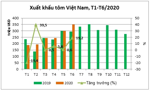 Tháng 6/2020, XK tôm Việt Nam đạt 349,9 triệu USD, tăng 19,2% so với tháng 6/2019. Đây là mức tăng trưởng tốt nhất kể từ...